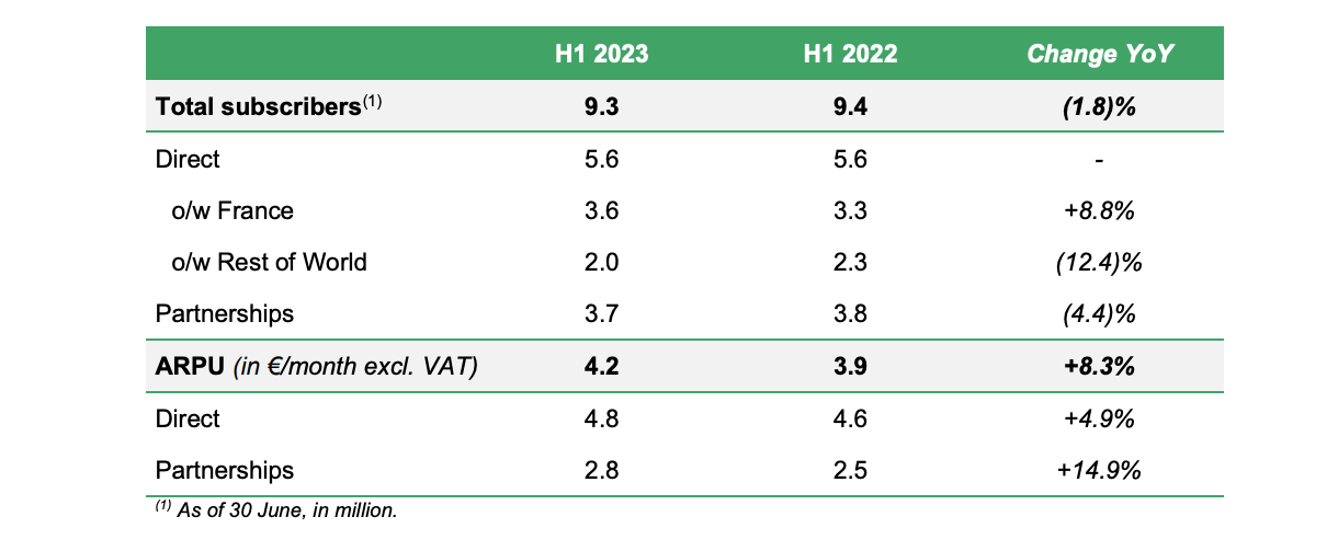Deezer’s ‘Direct’ subscribers in France grew to 3.6 million as of end of June 2023, up 300k from the same period a year prior.