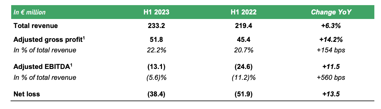 The firm’s adjusted H1 adjusted gross profit (+14.2% YoY to €51.8 million) improved, as did its half-year adjusted EBITDA loss, which weighed in at -€13.1 million in H1 2023 vs. -€24.6 millionin H1 2022.
