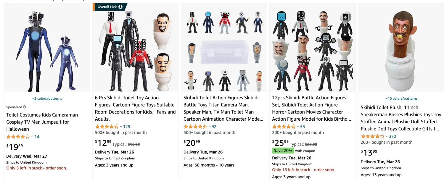 Skibidi Toilet is now so big, Amazonsells a virtually endless list of Skibidi pajamas, Skibidi figurines, Skibidi plushies, Skibidi rucksacks, Skibidi hoodies, Skibidi bedsheets etc.