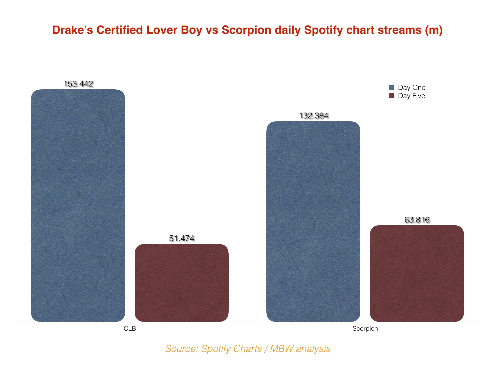 According to MBW’s analysis of Spotify’s numbers, Certified Lover Boy racked up 410.7 million cumulative global chart streams in its opening five days on Spotify’s platform.