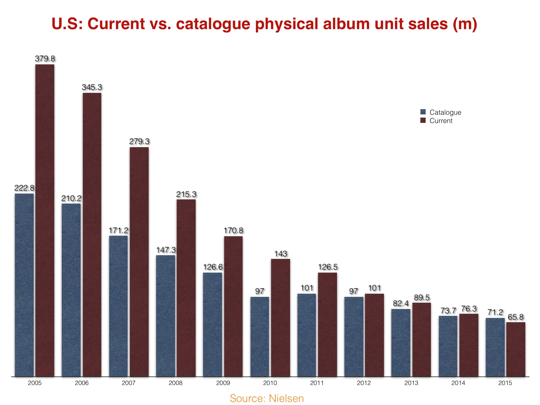 According to Nielsen data, catalogue albums – which it defines as any release over 18 months old – shifted 122.8m copies in 2015 in the US, down 2.9% on 2014’s tally of 126.5m.