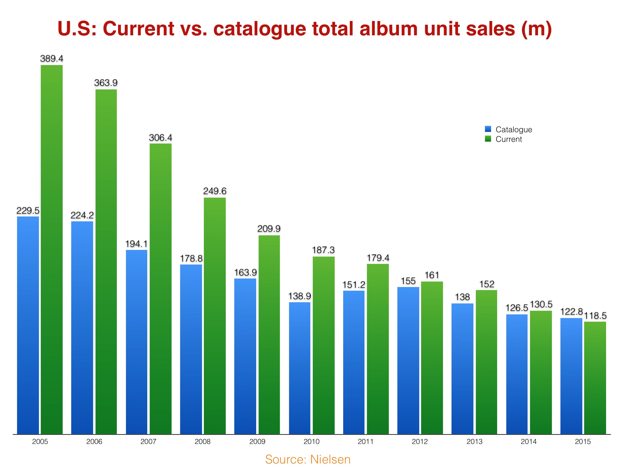 Catalogue tracks sold 484.9m in total in the US in 2015, according to Nielsen – down 14.9%.