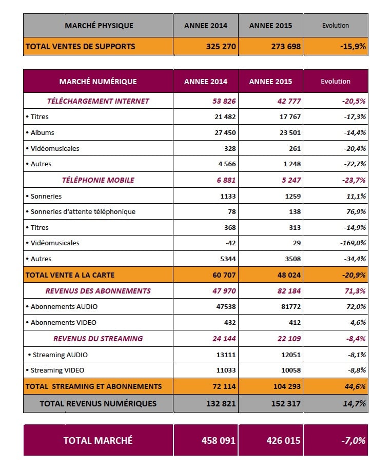 Revenues from downloads, including tracks, albums and videos, fell 20.5% in 2015 to €42.8m.