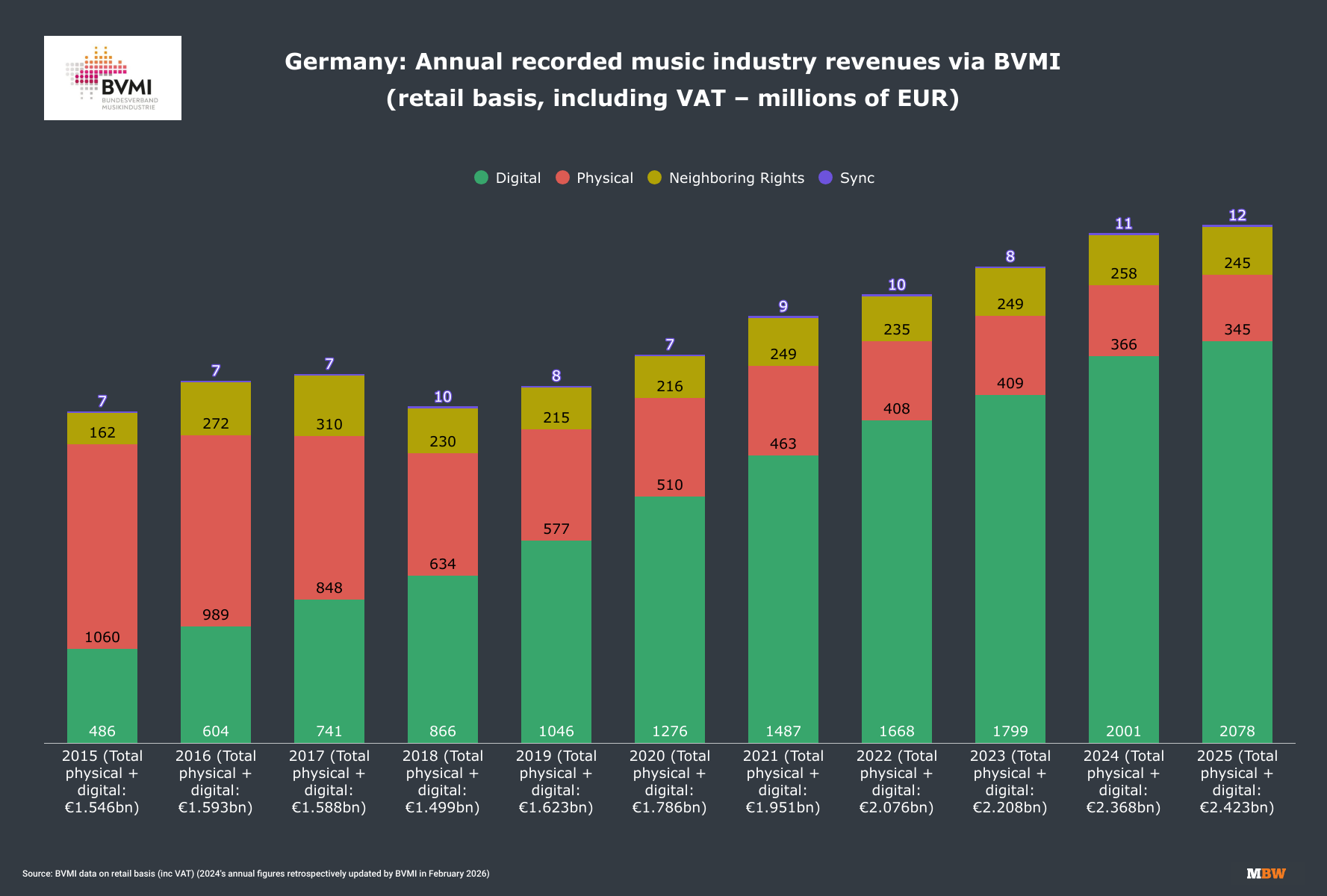 BVMI reports retail stats in Germany – i.e. the amount of money handed over by consumers at the tills, on online stores, and via their streaming subscriptions.