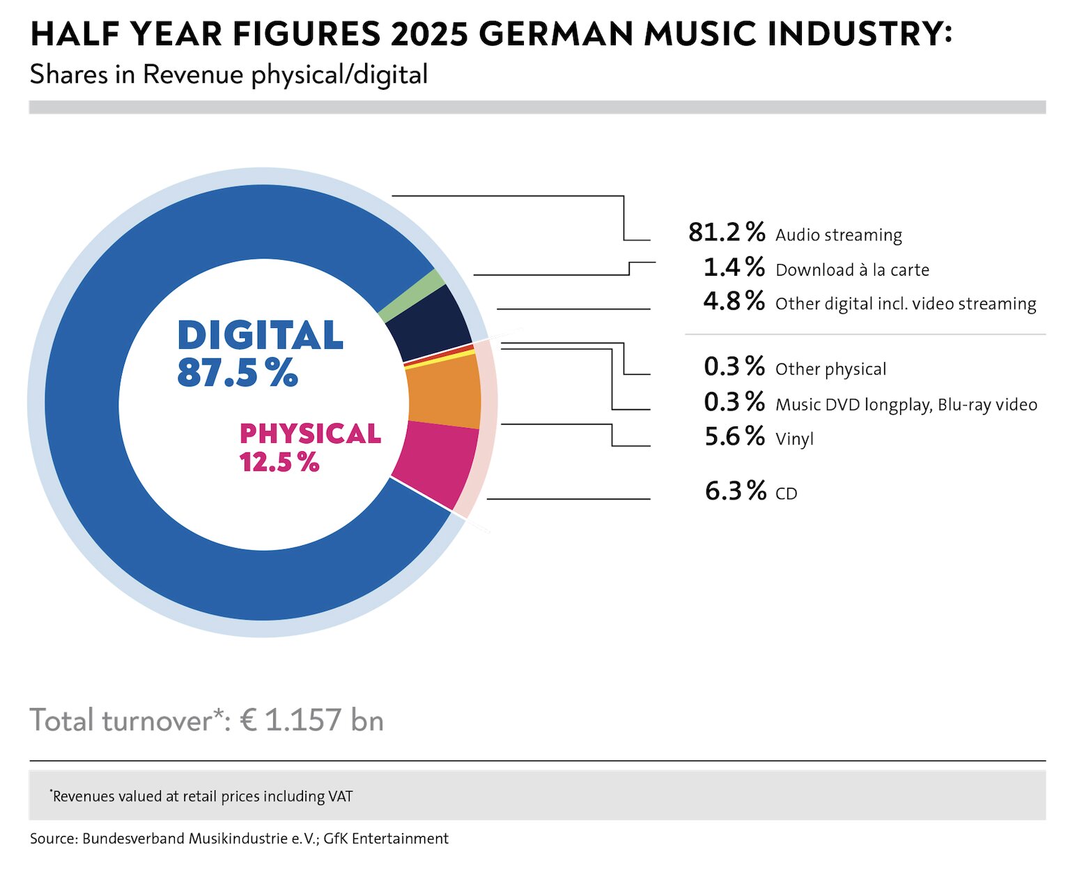 The German Music Industry Association (BVMI) says recorded music sales in the first half of 2025 hit EUR €1.157 billion (USD $1.36 billion at the average exchange rate for Q2 2025),on a retail basis. That’s up 1.4% from the same period a year earlier.
