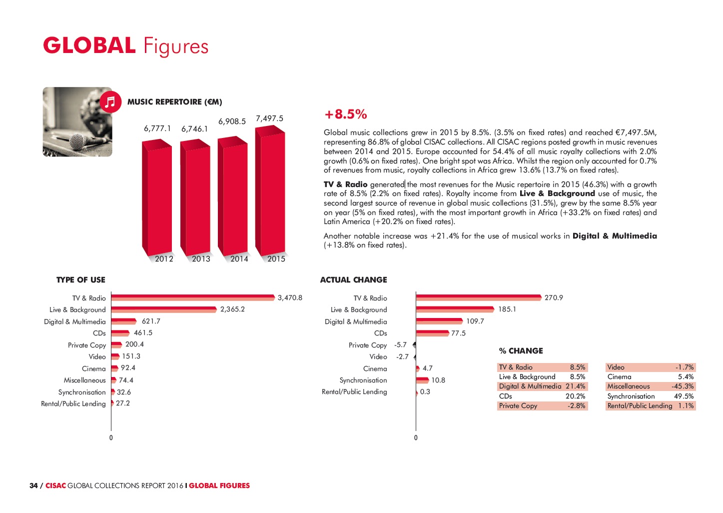 That represented an increase 8.5% on 2014, according to the International Confederation of Societies of Authors and Composers (CISAC) – although this figure was significantly boosted by favourable currency. (The increase stood at 3.5% at constant currency.)