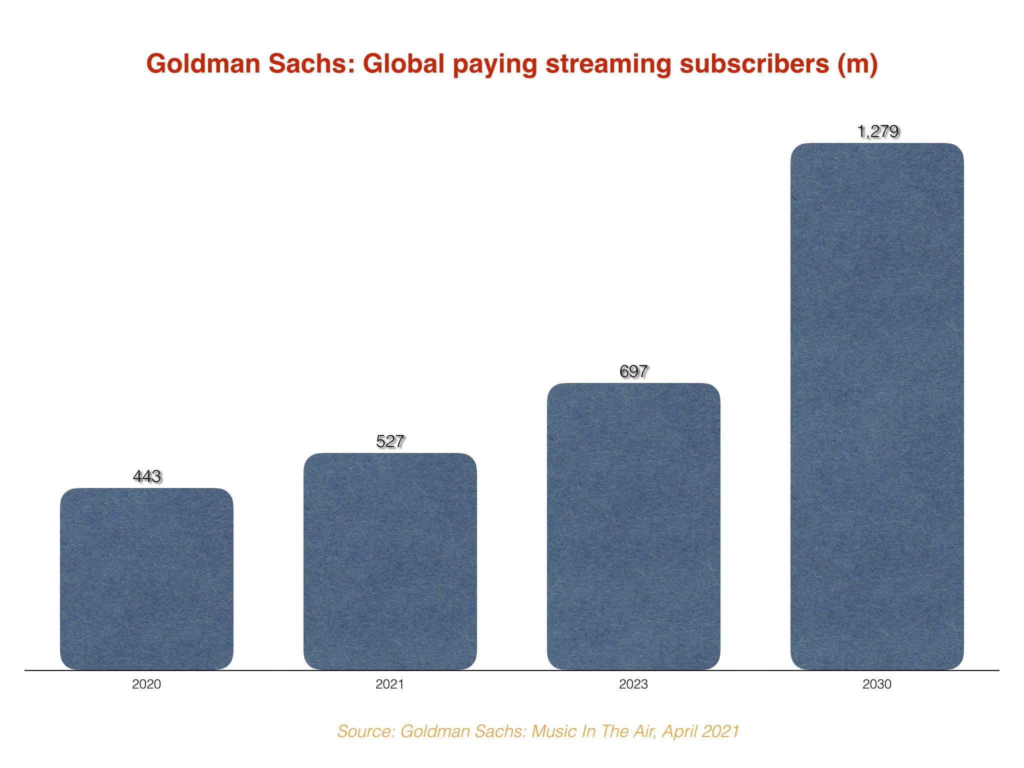 The prediction in the Goldman report that’s most likely to get the eyes of music biz prospectors pinging out on stalks concerns global music streaming subscribers.