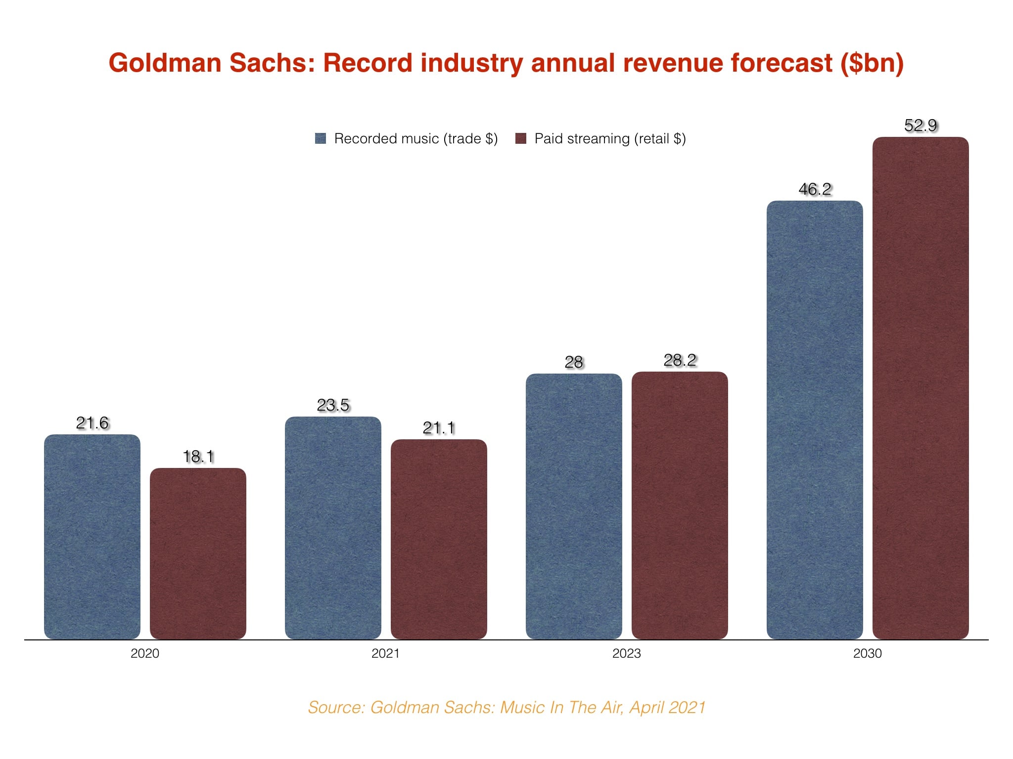 Goldman predicts that paid music streaming (in gross revenue terms) will generate $21.1 billion in 2021.