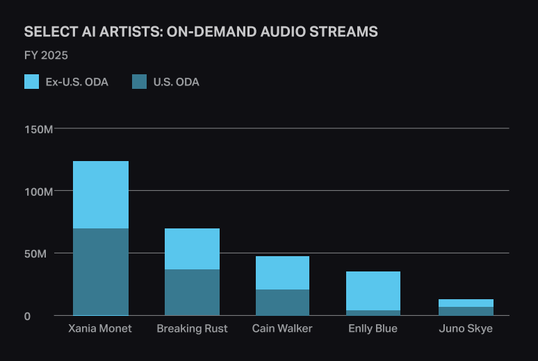 Luminate broke out total streams for certain AI artists, finding that Xania Monet was the most-streamed AI “artist” of 2025, with around 125 million streams globally and around 70 million in the US.