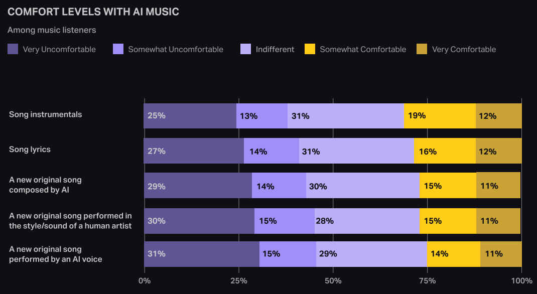 The idea of AI song instrumentals faces the least resistance, with 38% saying they are very or somewhat uncomfortable with it, while 31% say they are very or somewhat comfortable with it.