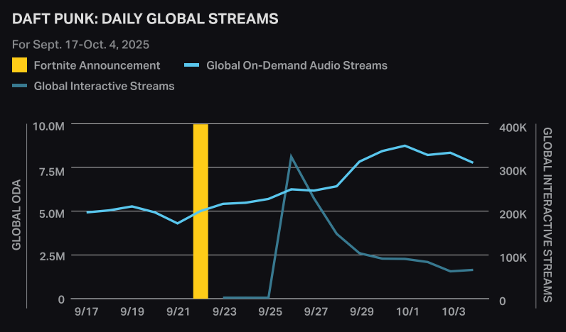 “Gaming platforms are now critical to artist marketing strategies,” Luminate said, reporting a 47.9% jump in Daft Punk streams in the first week after The Daft Punk Experience debuted on Fortnite.