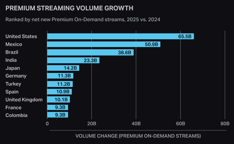 While India is primarily an ad-supported market (84% of streams), its premium streams grew by 42% YoY, adding 23.3 billion new premium streams in 2025.