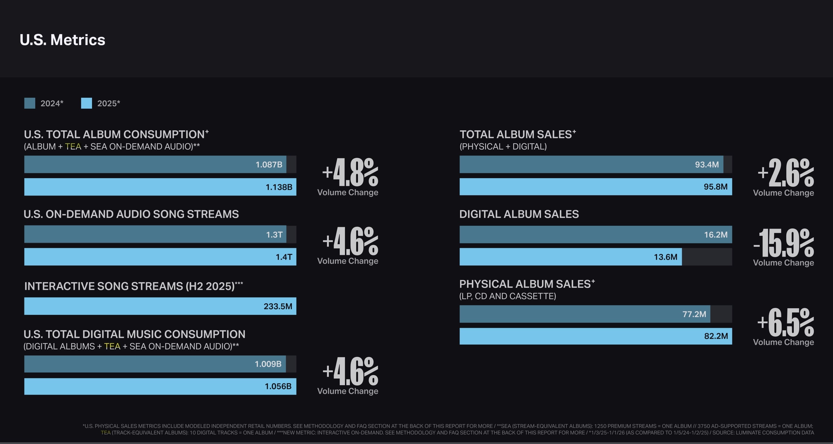 Total album consumption (TAC) in the US grew by 4.8% YoYto 1.138 billion, Luminate reported.