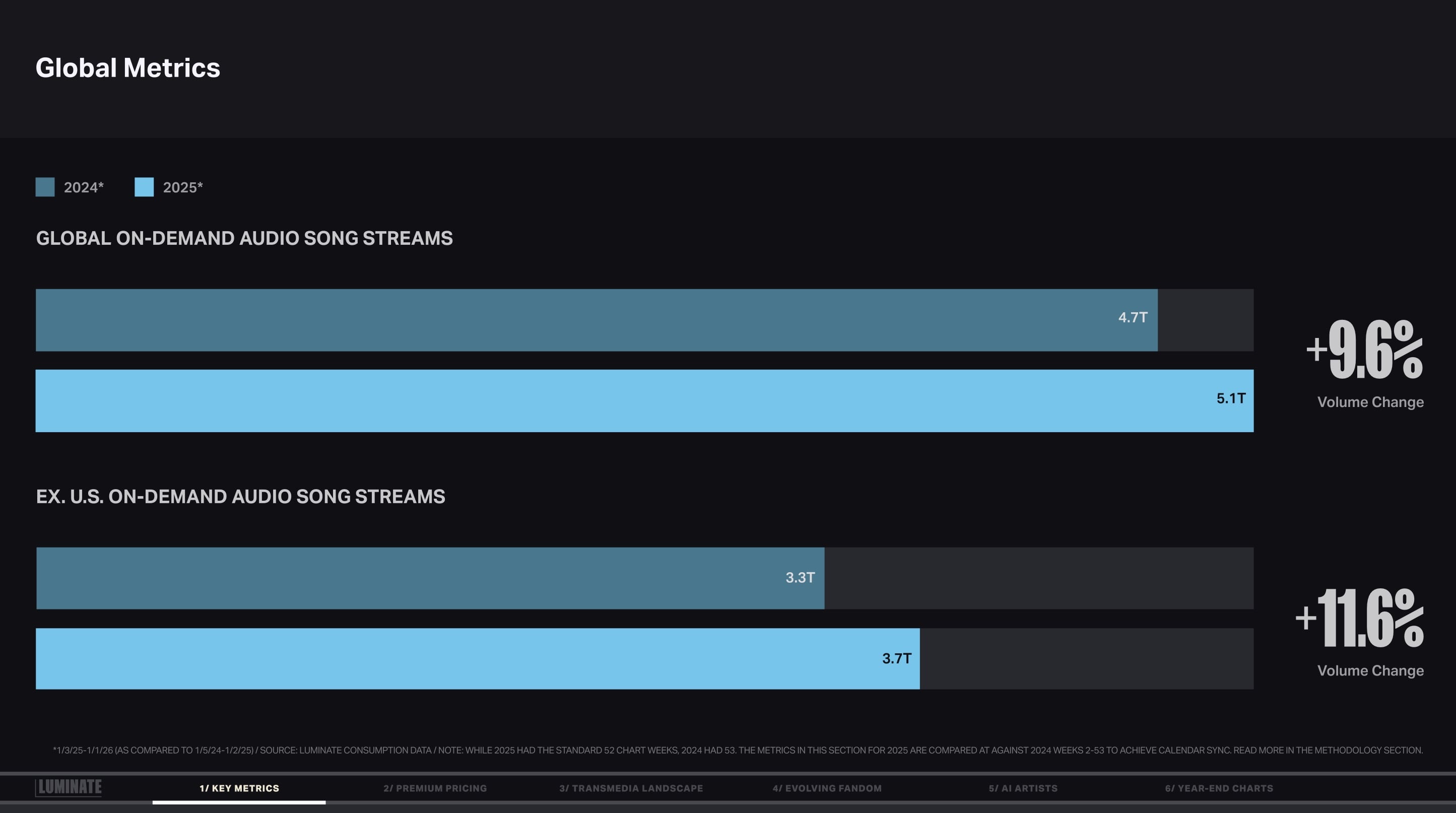 In its year-end report for 2025, Luminate – the company whose data powers the Billboard charts – said that global on-demand audio song streams topped 5.1 trillion in 2025, up 9.6% YoY from the year before. (see below)
