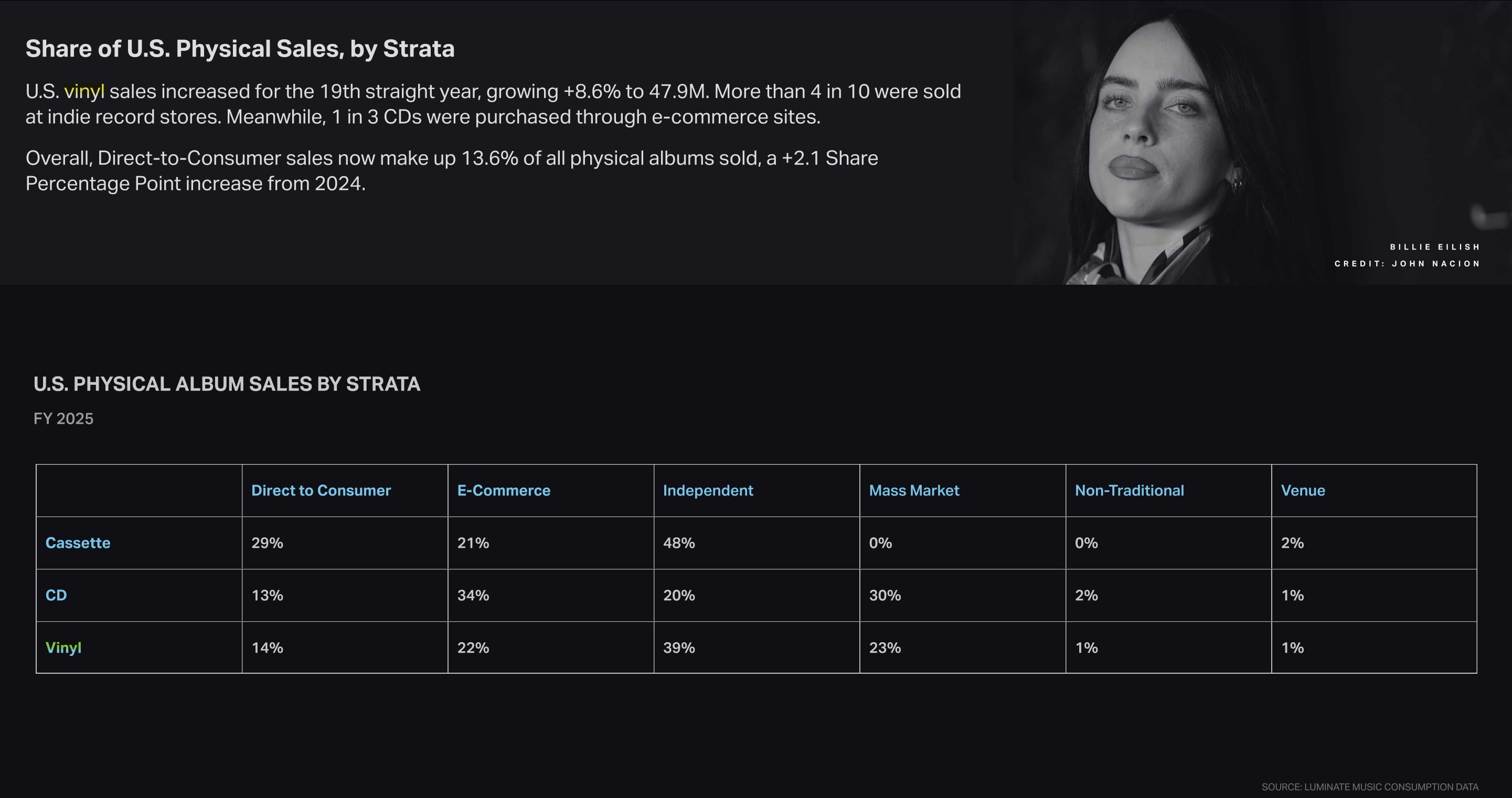 Luminate reports that Direct-to-Consumer sales now make up 13.6% of all physical albums sold. Broken down by format, the report reveals that 14% of vinyl sales took place via Direct to Consumer channels in FY 2025.