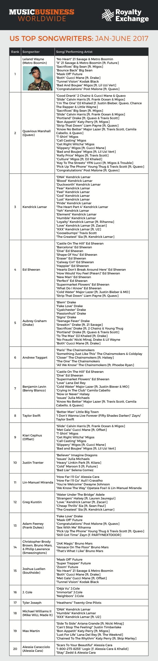 The Top US Songwriters chart for Jan-June this year has been exclusively compiled for MBW by online royalty marketplace Royalty Exchange.
