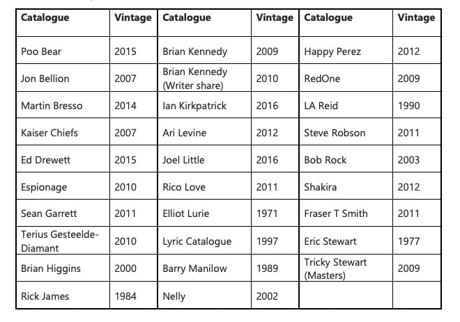 They do not, however, include the biggest revenue-earning assets acquired in that transaction, including songwriting rights from Steve Winwood, B-52’s, and Walter Afanasieff (co-writer of Mariah Carey’s All I Want For Christmas Is You).