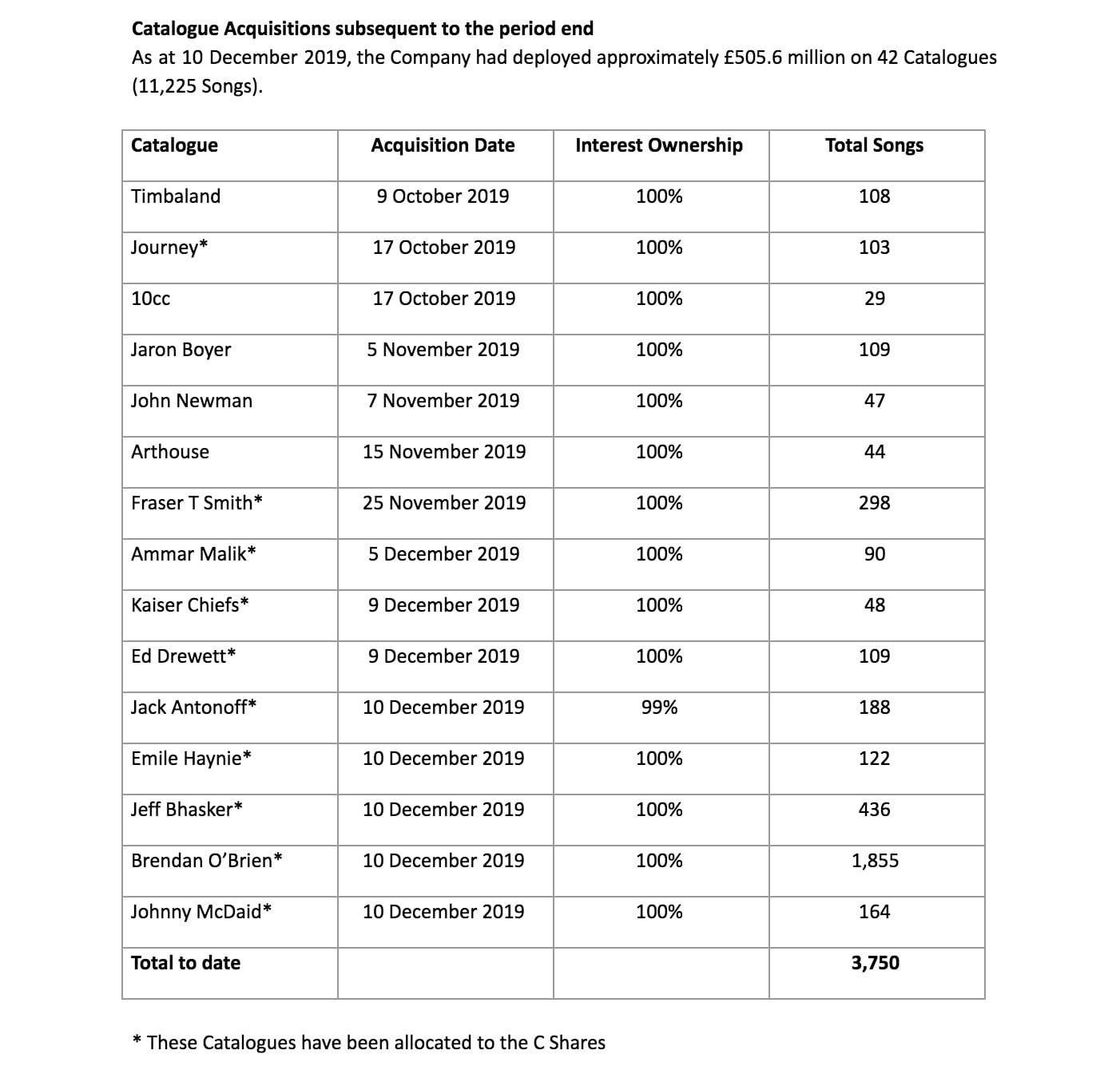 “We would like to thank all our Shareholders for supporting our thesis that songs are a new highly investible asset class and we look forward to updating them as we acquire some of the greatest songs of our time in the coming months.”