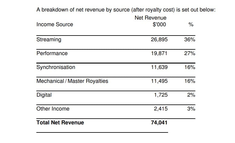 Of that $74.1 million, some $26.9 million (36%) came from streaming platforms, while $19.8 million (27%) came from performance royalties, and $11.6 million (16%) came from synch licensing. (See below for a full breakdown.)
