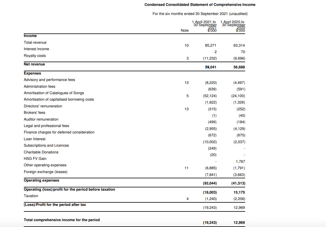 Other headline numbers for Hipgnosis Songs Fund in the half-year period (to end of September 2021) include: