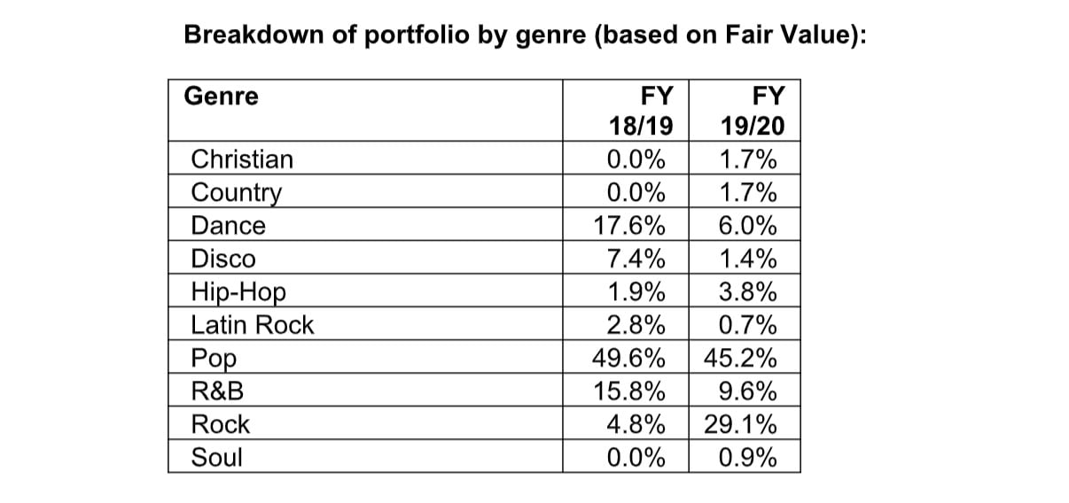 This shift was further reflected in the fact that some 49.6% of the fair value of Hipgnosis’ portfolio of songs at the close of March 2019 came in the Pop music genre. By the end of March 2020, Pop’s share had fallen to 45.2%, while the share of Rock songs grew year-on-year from just 4.8% to 29.1%.