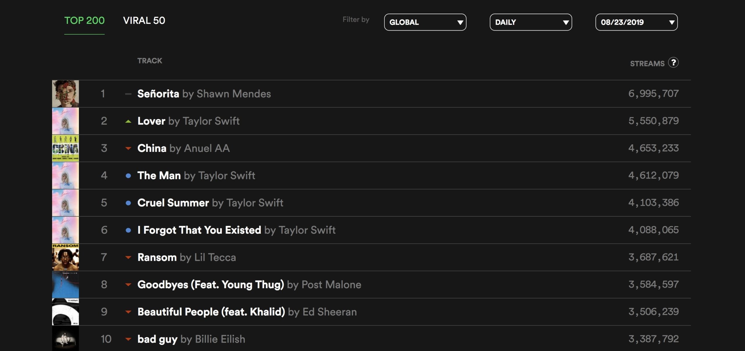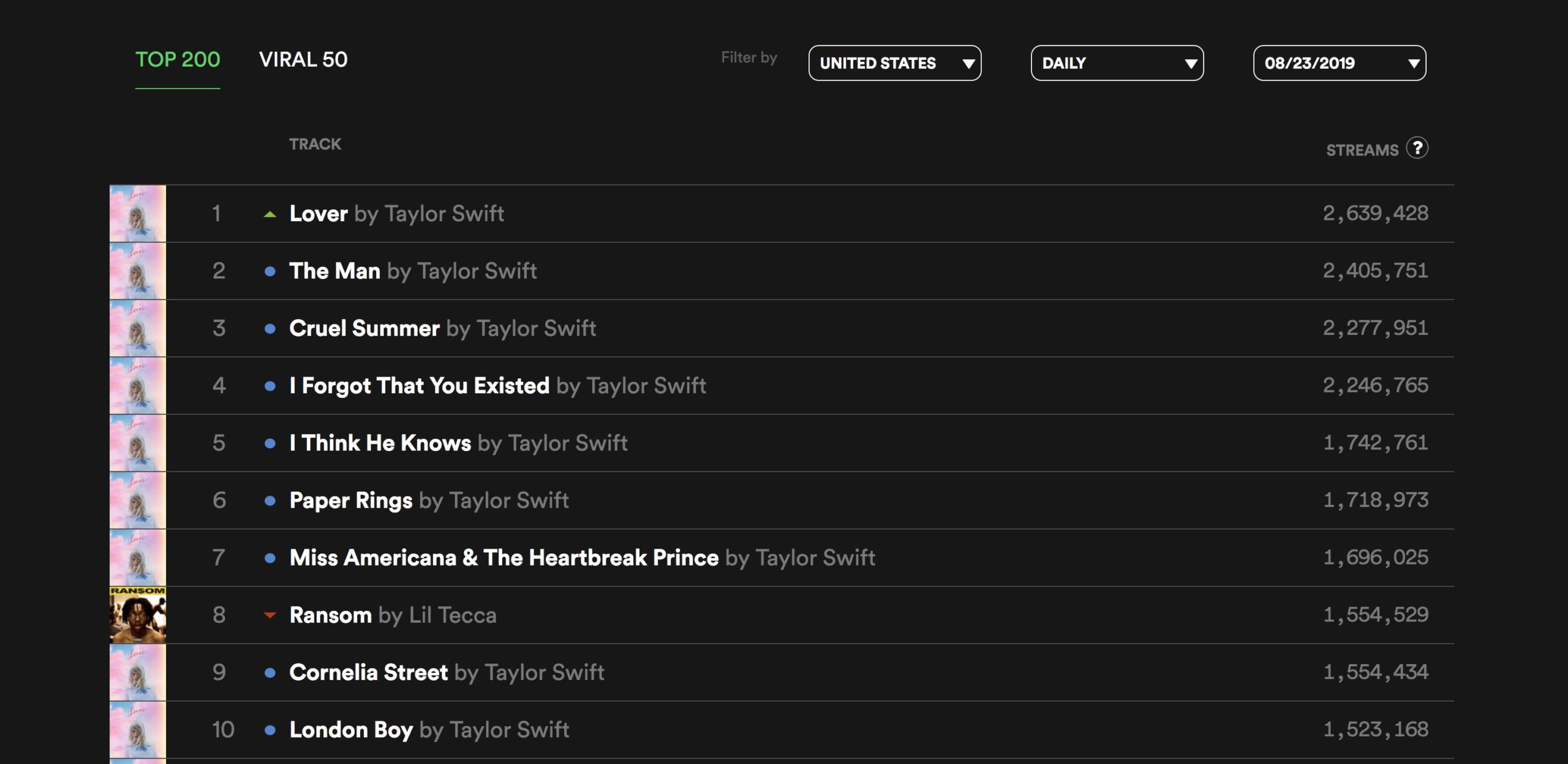 Before doing so, we should point out that four of Lover’s 18 tracks were actually available on Spotify ahead of the album’s official release date of August 23: ME! (released April 26), You Need To Calm Down (June 14), The Archer (July 23) and Lover (August 16).