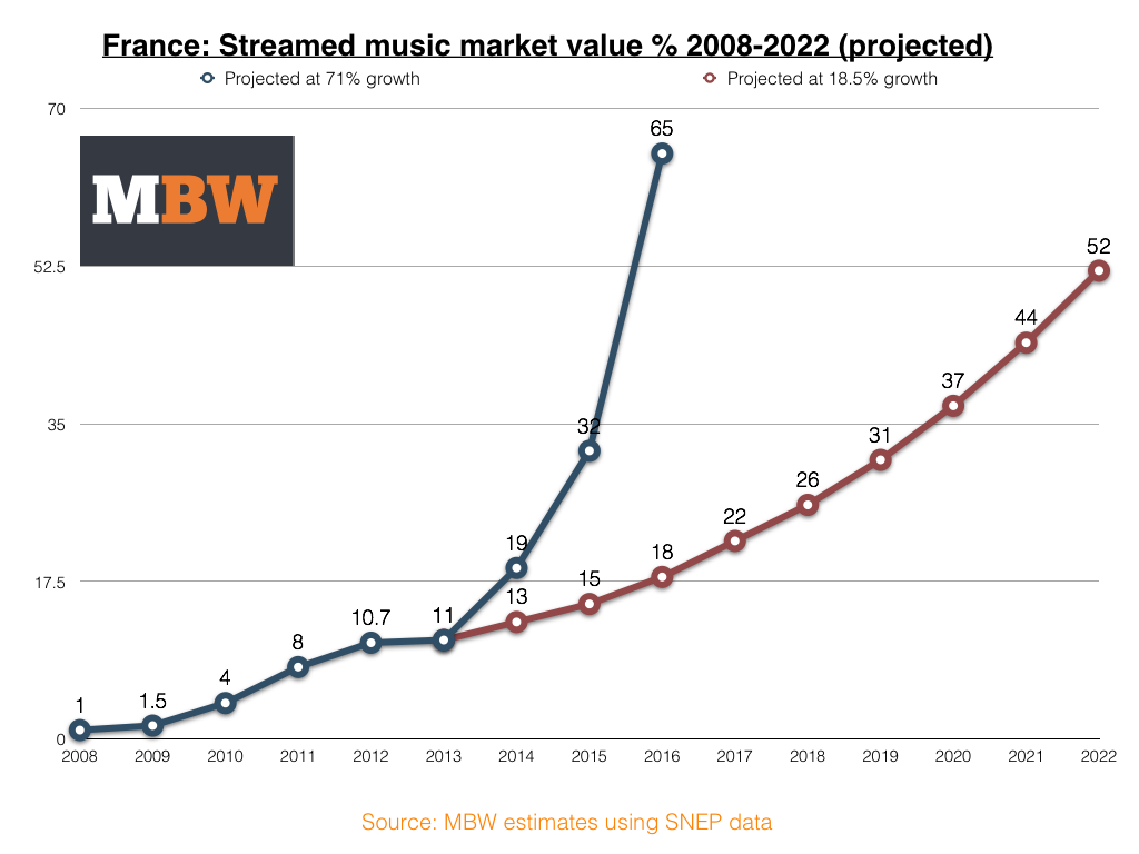 MBW forecasts that streaming could provide 50%+ of France’s annual record industry income as early as 2016 – but only if a pattern of fast streaming market share growth returns following a significant slowdown in 2013. Looked at more conservatively, the watershed moment in France could take as long as 2022 to arrive.