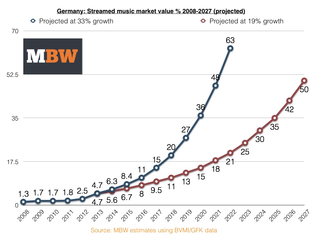 Even with an optimistic crystal ball, it should take Germany until at least 2022 for streaming to overtake the joint commercial might of physical and downloaded music.