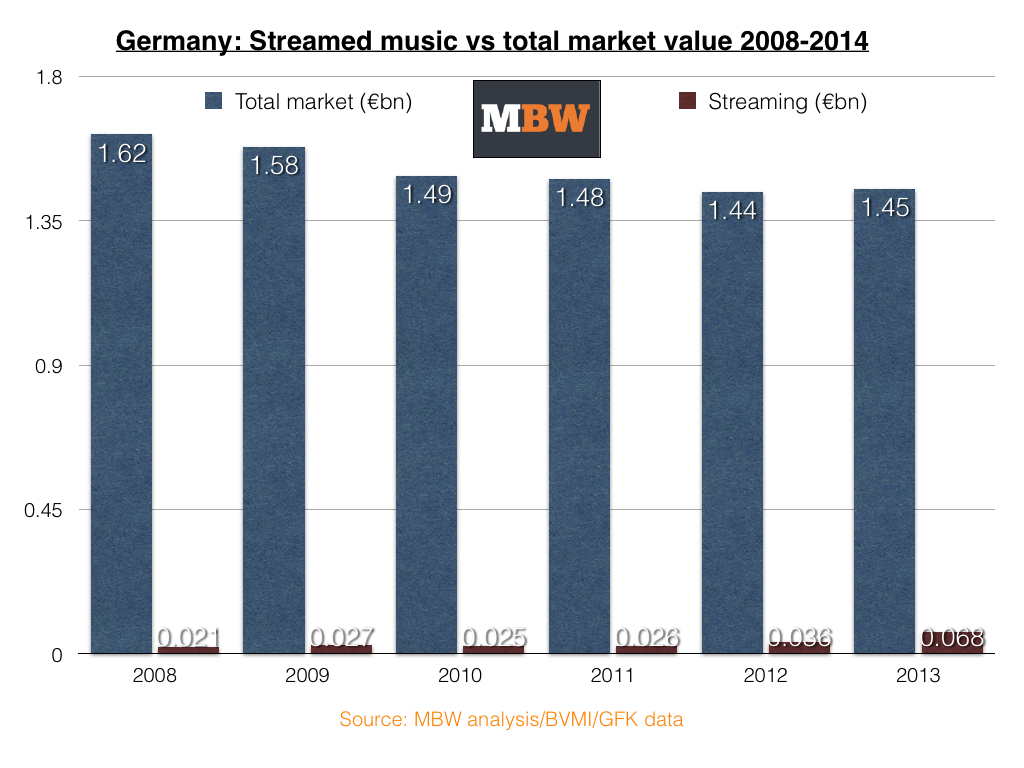The last figures on record from BVMI/GFK are for 2013, when by generating 68m Euros in Germany, streaming claimed just 4.7% of a €1.45bn marketplace.