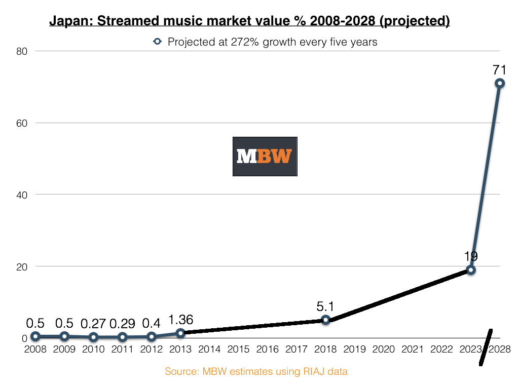 Japan, though, is a whole different kettle of fish: its streaming growth to date has been so slow, current trends suggest that streaming wouldn’t hit a 50% market value in Japan until at least the middle of the decade starting in 2020.