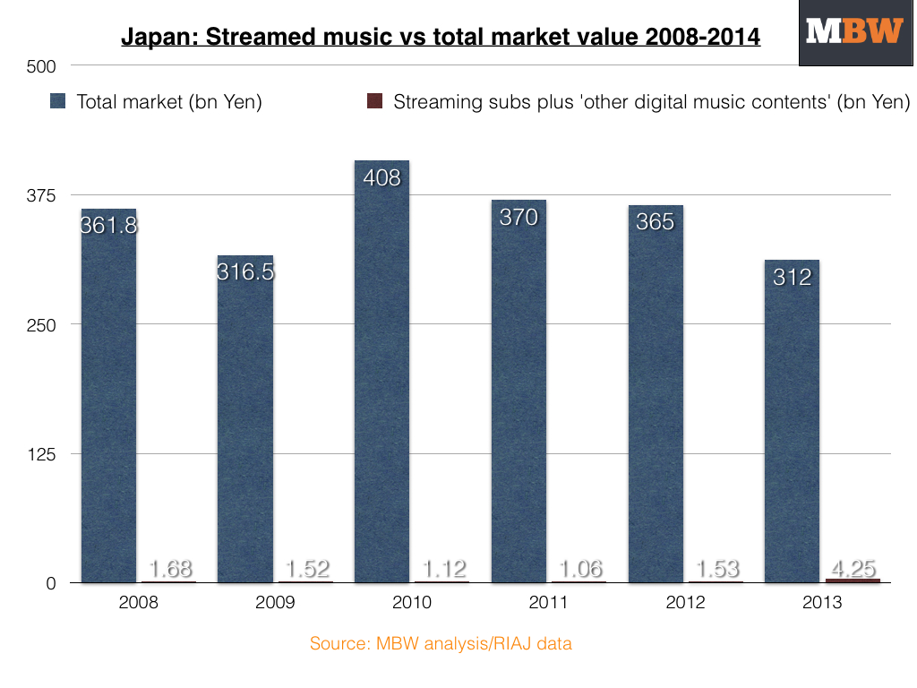 Even when you factor in miscellaneous ‘other digital music contents’ (likely YouTube) from the RIAJ’s numbers, streaming subscriptions still only generated 1.36% of the Japanese music market in 2013 – the last year on record.