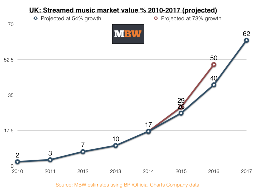 If applied to future years, that would see streaming take a 50% share of the UK recorded music market’s annual income by 2016.