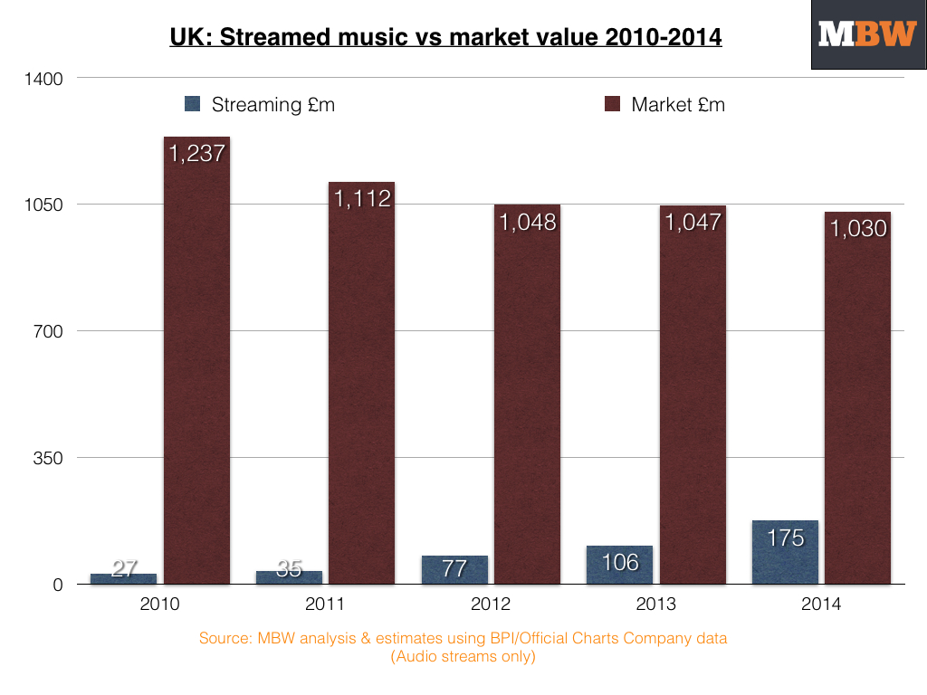 Luckily, the BPI has just released its market value figures for 2014, which show streaming taking a 17% market share, generating £175m in the year.