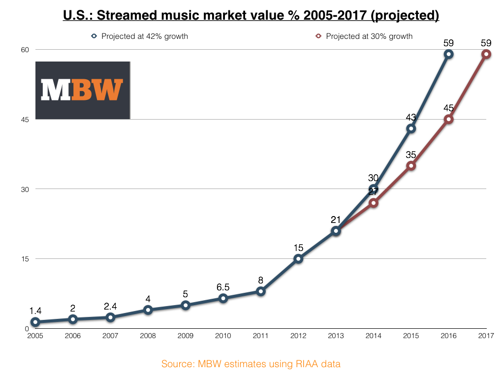 Applying this to the future means that streaming would claim more than 50% of the market by value in 2017 – possibly ending that year by generating more than 60% of all industry income.