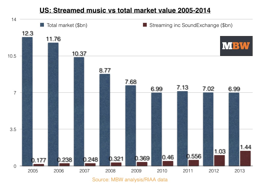 The RIAA, the US body which measures the market in value terms, is yet to announce its figures for 2014 – meaning the last hard data available relates to 2013.