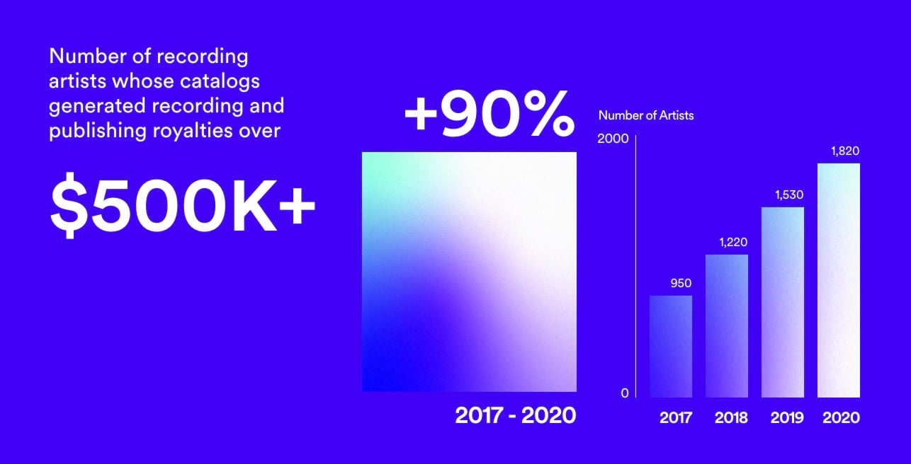 The $500k-plus-per-year club counted 1,820 artists in 2020.