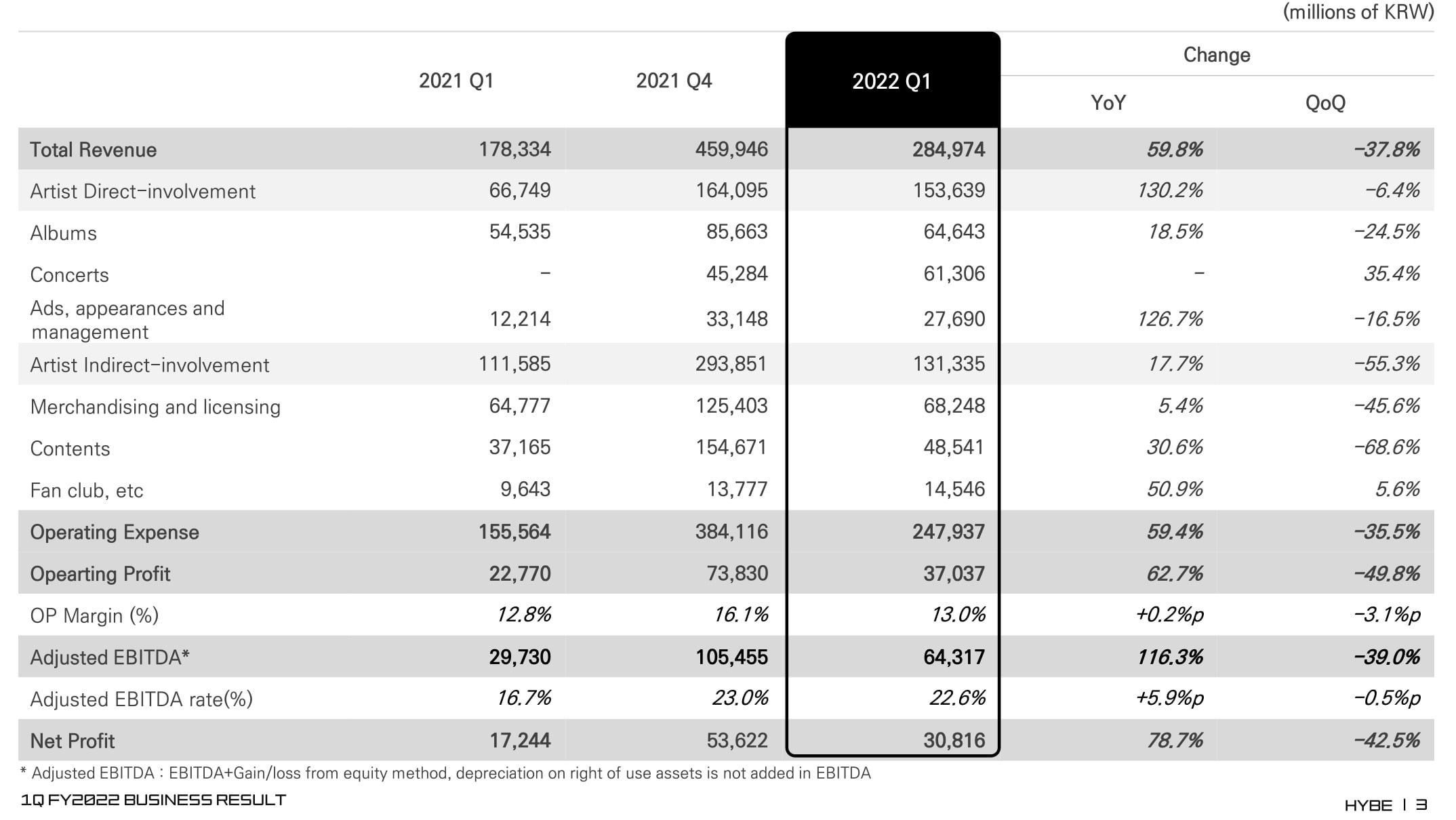 HYBE’s Net Profit in Q1 2022 was South Korea Won 30.8 billion ($24.4m), up 78.7% YoY.Music Business Worldwide
