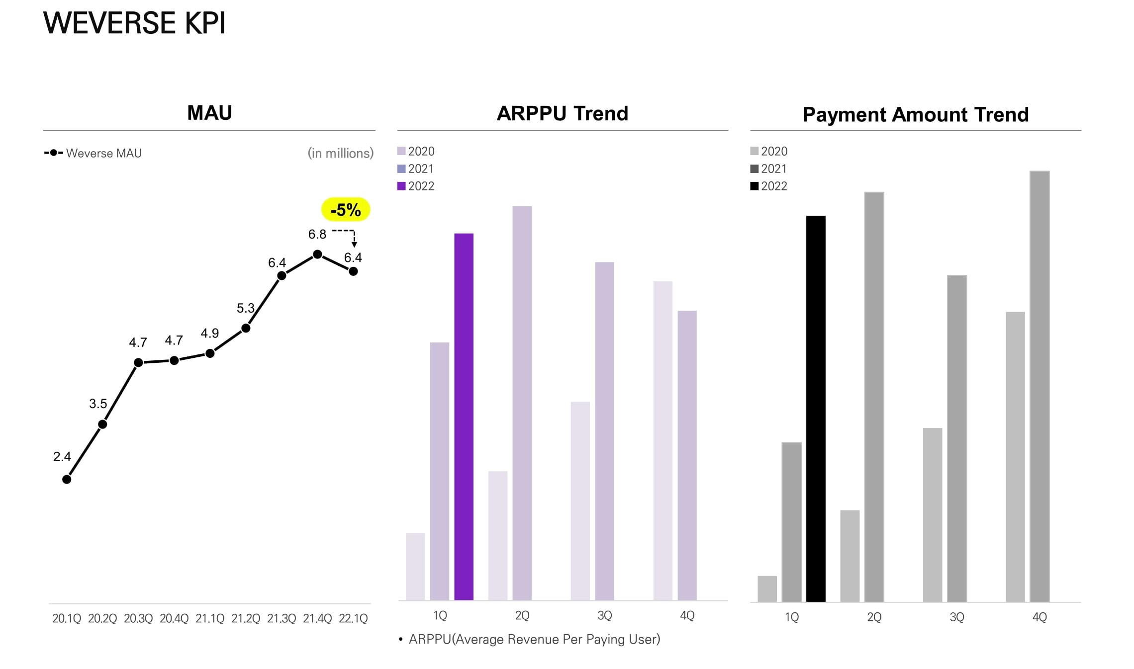 Weverse’s user numbers fell by 5% in Q1, to 6.4 million, versus the 6.8 million reported at the end of the prior quarter (Q4 2021).
