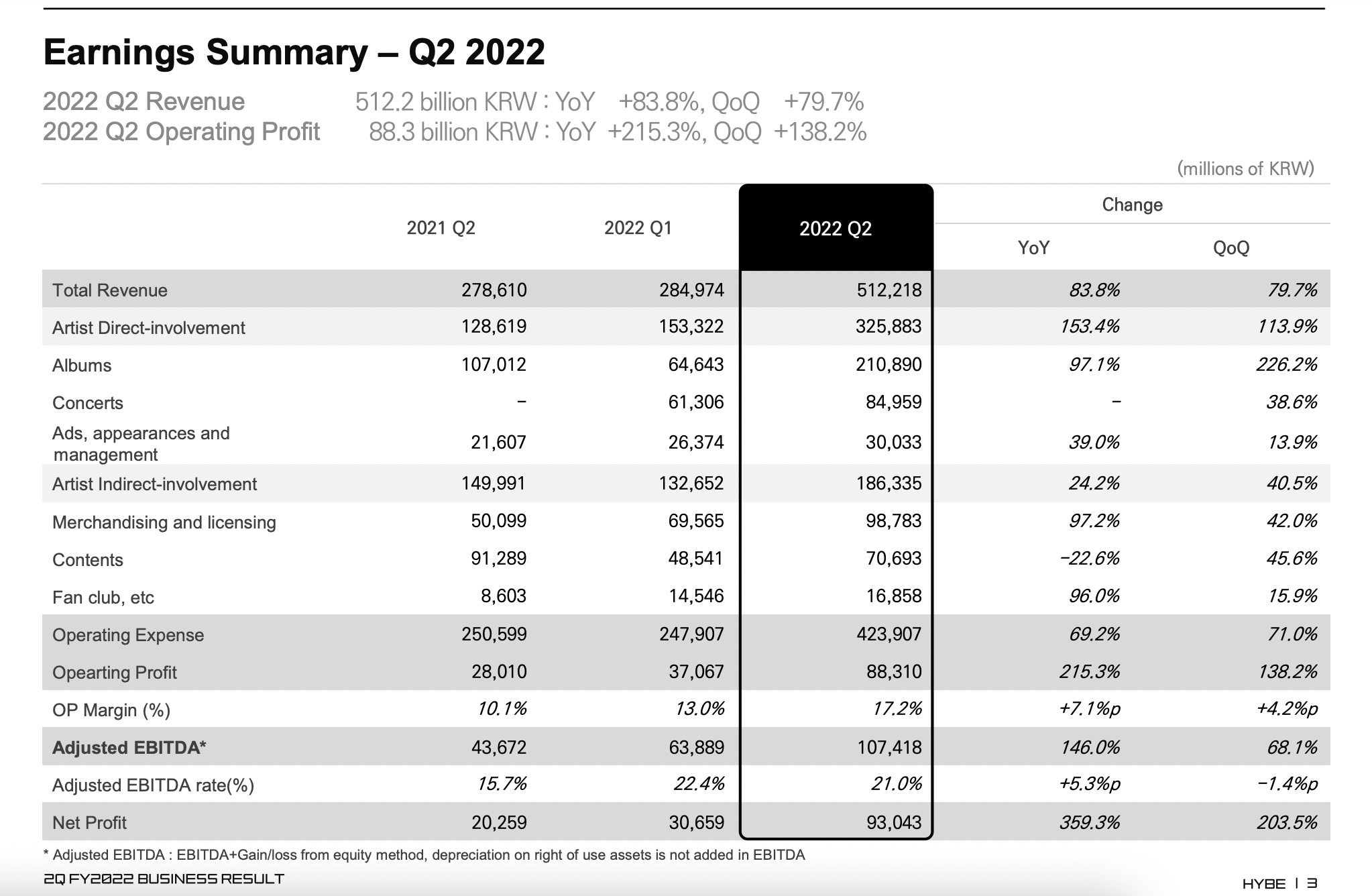 Today (August 3), the Seoul-headquartered music company has published its financial results for the three months ended June 30 (Q2 2022), revealing soaring revenues, driven by strong album sales and a robust “Artist Direct-involvement” business.