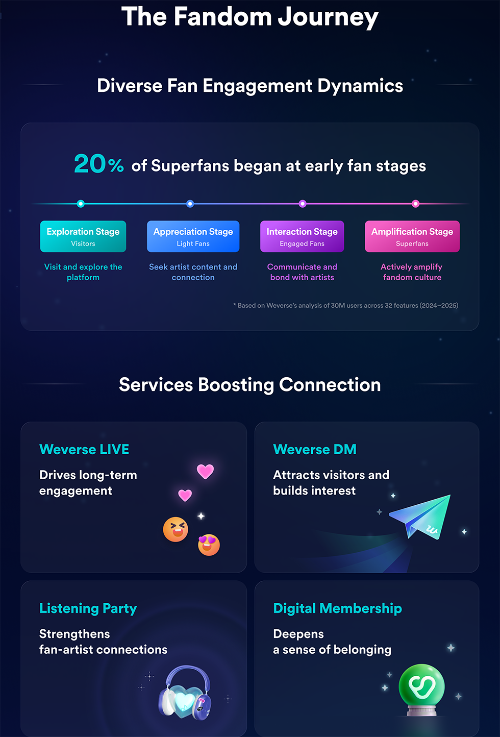 Weverse’s 2025 Fandom Trend Report takes a crack at answering that. HYBE tracked how 30 million users engaged with 32 platform features across 2024 and 2025, mapping out four stages of fandom: from occasional browsers to the most dedicated fans who buy collectibles, attend events, and drive fan culture online and offline.