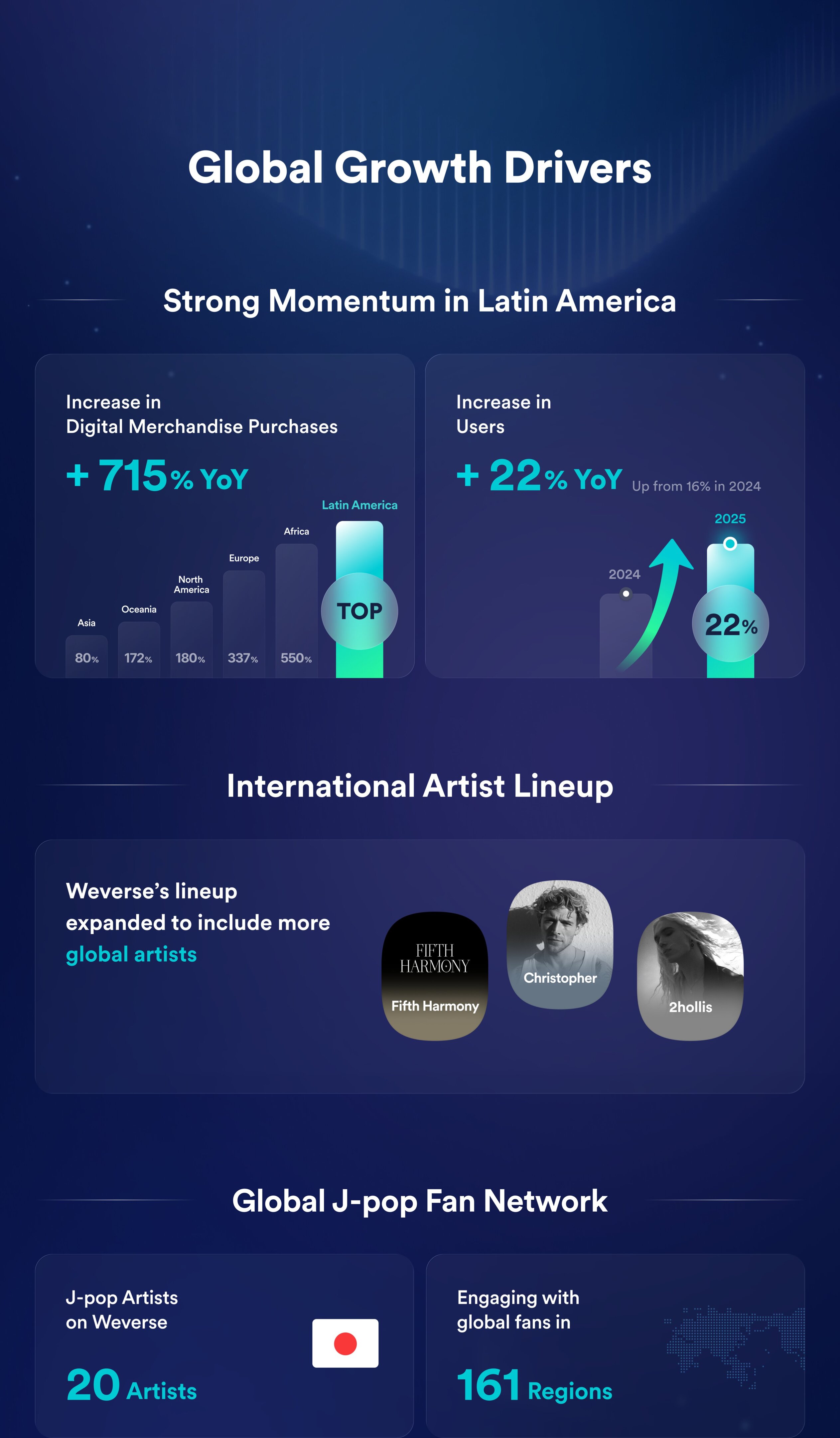 Perhaps the most eye-catching regional data point: Latin America was Weverse’s fastest-growing market in 2025, with a 22% YoY increase in users and a 715% YoY surge in digital merchandise sales.