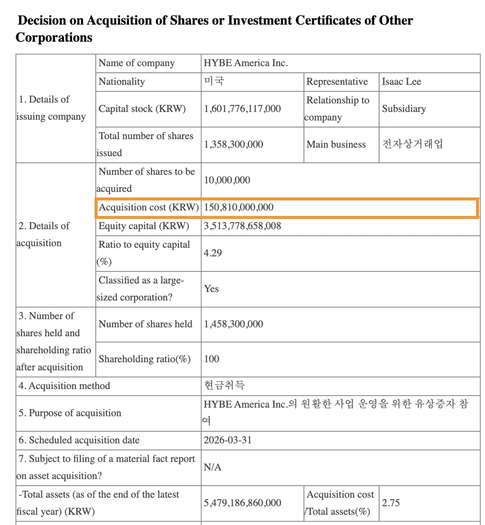 The acquisition amount of KRW 150.8 billion ($100m) was calculated using the Seoul Foreign Exchange Brokerage’s quoted exchange rate of KRW 1,508.10 per US dollar on March 30.