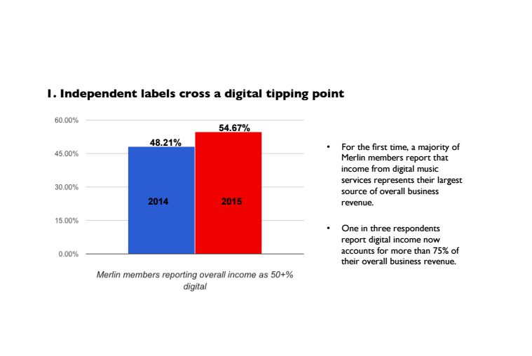 - Independent labels have crossed a digital tipping point. For the first time, more than half of respondents report that income from digital services accounts for over 50% of their overall business revenues. For one in three, digital income accounts for over 75% of their overall revenues.