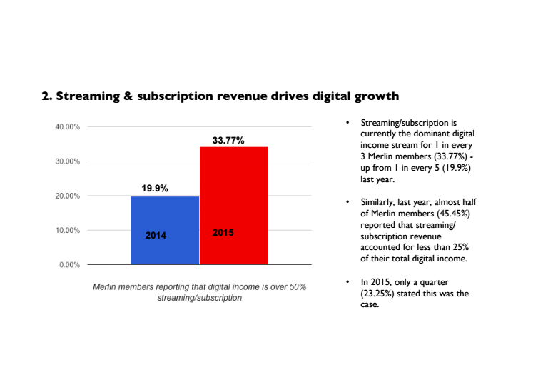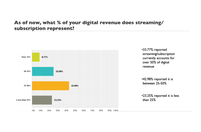 - Streaming/subscription income is driving digital growth. One in three respondents report that income from audio streaming & subscription services now accounts for over 50% of their digital revenue – up from one in five in 2014.