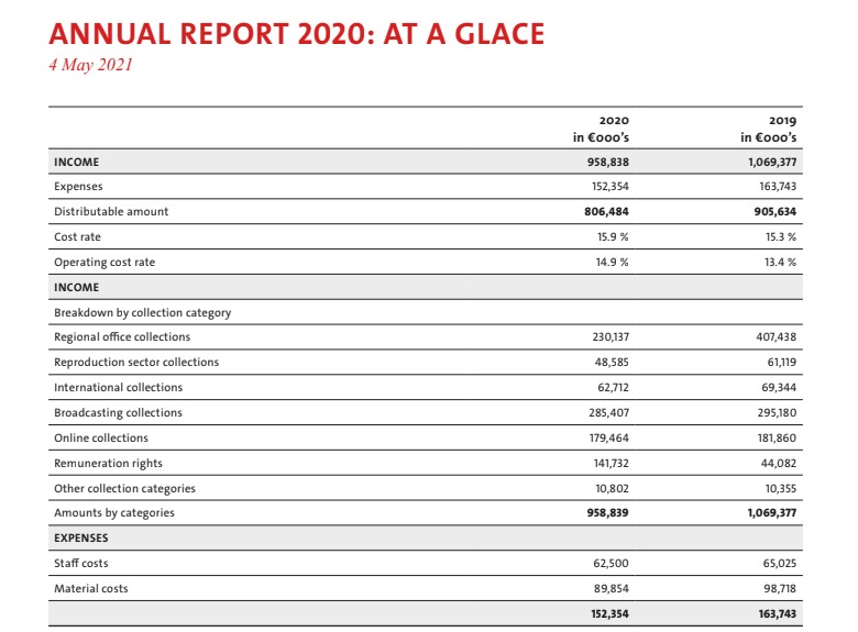 Eagle-eyed music rightsholders might note in the table above that GEMA’s expenses in 2020 dropped by €11.4 million YoY during the pandemic-hit 2020, while the PRO’s revenues fell by €110.5 million.