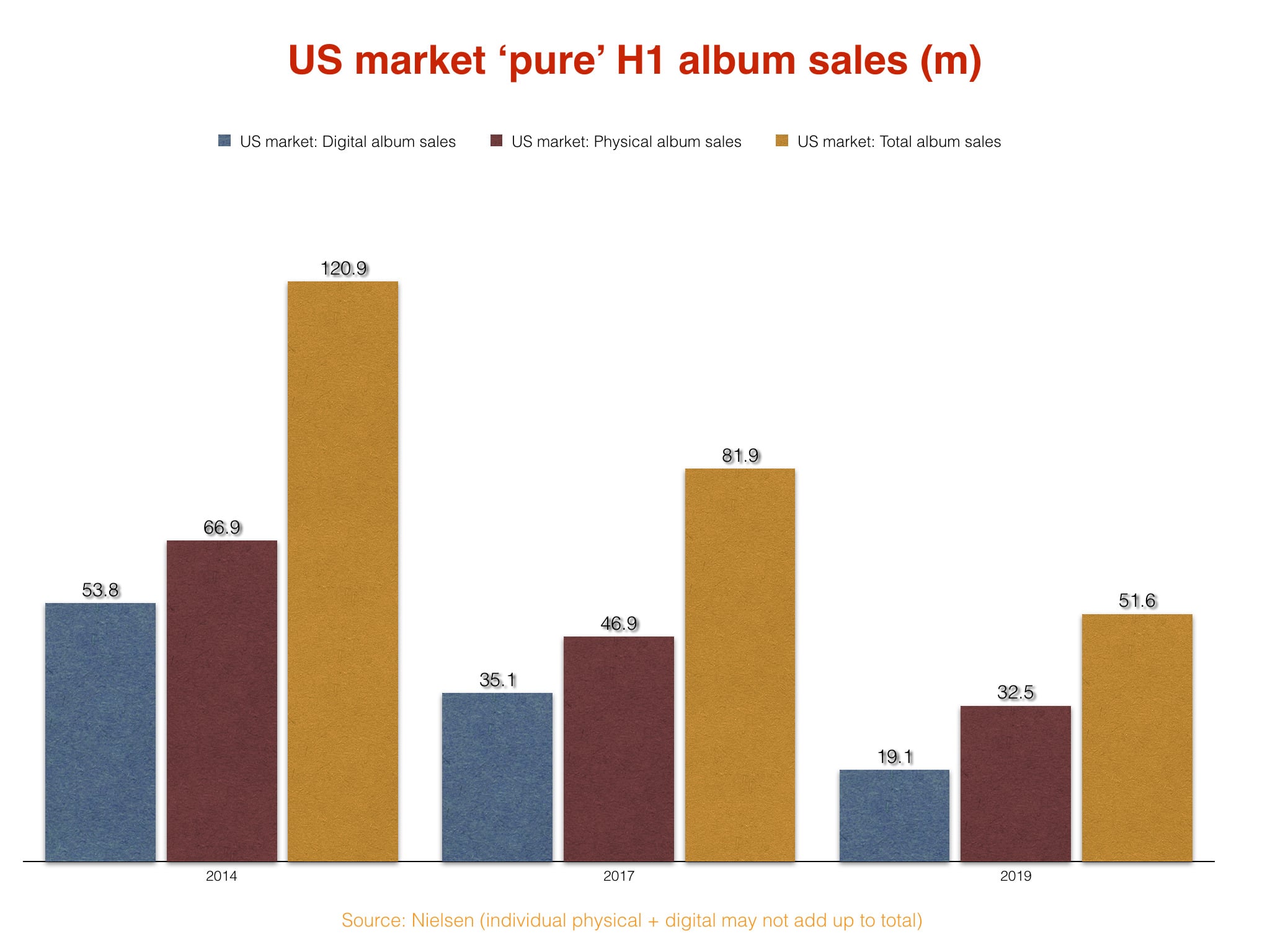 According to Nielsen data, overall ‘pure’ album sales (see below) in H1 2017 (ie. the year Reputation was released) vs. H1 2019 (ie. the year Lover was released) fell 37%, from 81.9m to 51.6m.