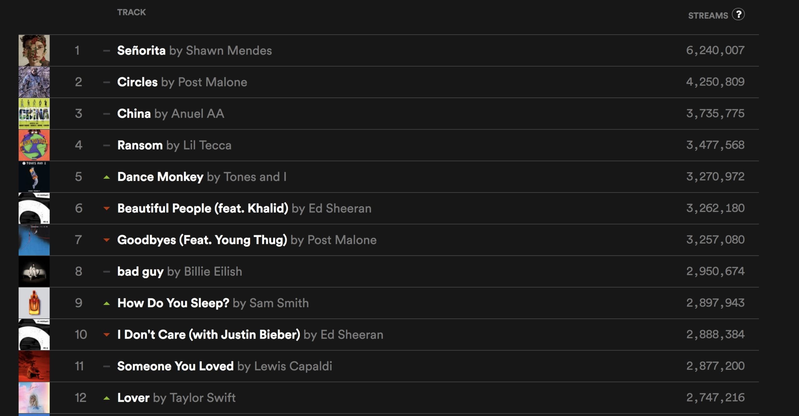 As of yesterday (September 3), Lover did not have a single track in Spotify’s global daily Top 10. In contrast, Ed Sheeran’s No.6 Collaborations Project, nearly two months past release, had two: I Don’t Care (with Justin Bieber) at No.10 (2.89m daily streams), and Beautiful People feat Khalid (No.6, 3.26m daily streams).