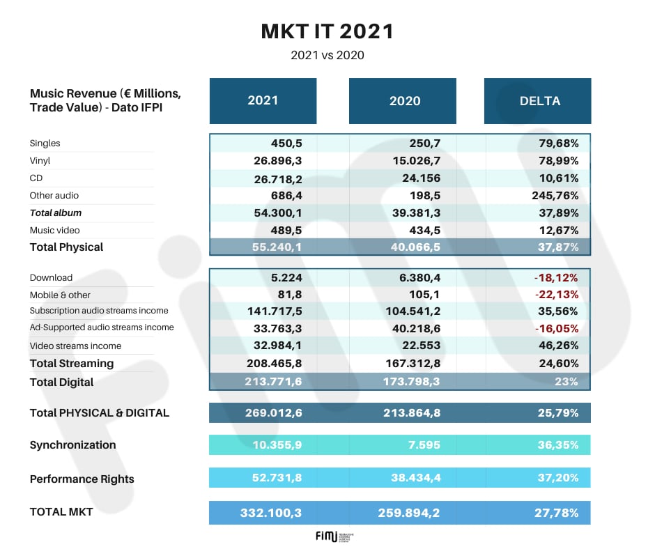 Italian recorded music revenues grew 27.8% in 2021 to reach $392.4 million (€332m), up €72m ($85m) versus 2020, when the market generated €259.89 million ($296.3m) in recorded music revenues.