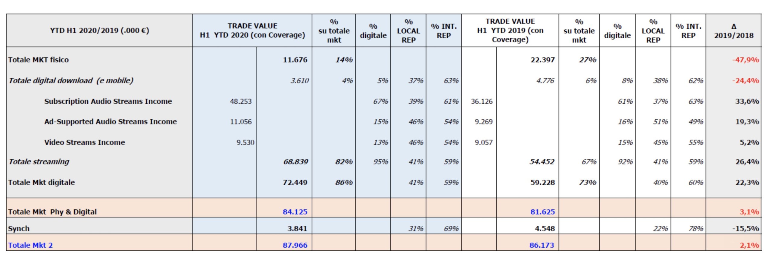 Removing sync from the equation – leaving us with just music streaming and sales revenues – Italy’s recorded music market was up 3.1% YoY in H1 2020.