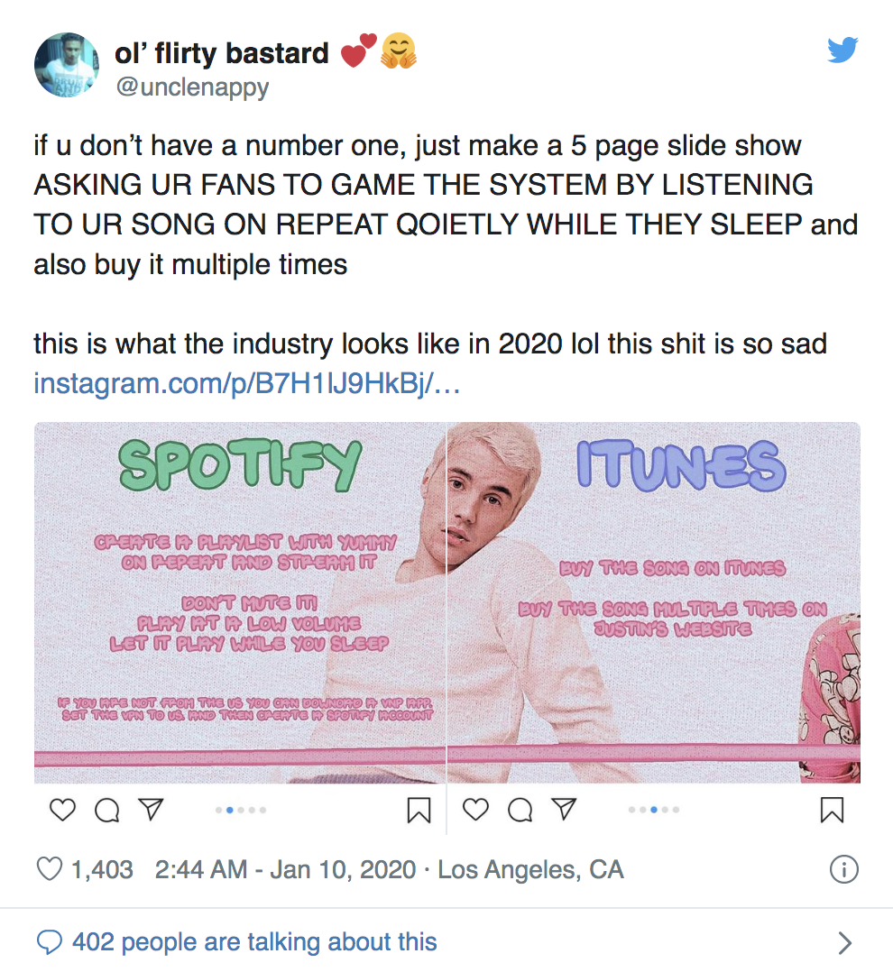 As reported by the Verge, the now-deleted post first appeared on fan account, Outlyning (which has 115,000 followers), stating: “Justin really wants that #1 and he is really excited about it as he said yesterday in his livestream. If you don’t want to do any of this it’s totally fine, just ignore the post. ✌️This is tips for the people who actually wants to do an extra effort!”